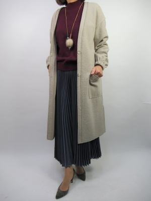ふんわり柔らかなニットをプリーツパンツで合わせる。全体にエアリー感が出て、さらに色の組み合わせもパープルとの相性が良いグレー系でまとめて上品なお出かけコーデです!スタイリッシュ度70%、エレガンス度30%。