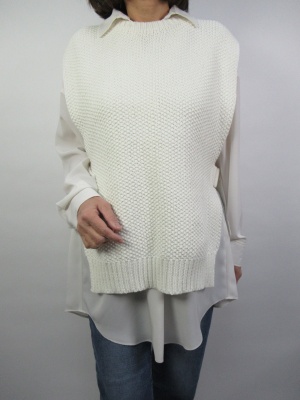 丈長のブラウスにベストの組み合わせ。カジュアルにデニムで合わせてみました。少しゆるさのあるデニムで合わせるとスタイリッシュなデイリーファッションにつながります!アクティブ度80%、フェミニン度20%。