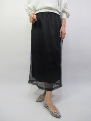 スポーティーテーストのライン入り。スカートもメッシュレースを重ねることでキレイ目のスポーティーラインになる。トップスもお揃いのトレーナータイプ。デイリーでも使える休日ファッション!アクティブ度80%、スタイリッシュ度20%。
