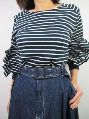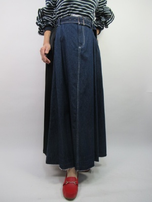 デニムスカートも右側だけに別布のプリーツをはさんだ、とてもオシャレなスカートにトップスは袖にボリュームを持たせたカットソーで華やかに!フェミニン度60%、カジュアル度40%。