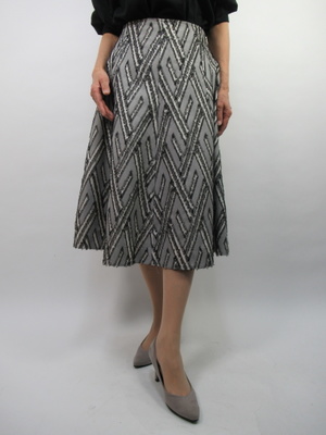 (黒×グレーの上品フェミニン) フレアのスカートはフリンジ刺繍を施したエレガントな生地がポイント。トップスはボリューム袖のカットソーでキュートな大人フェミニンに仕上げました。