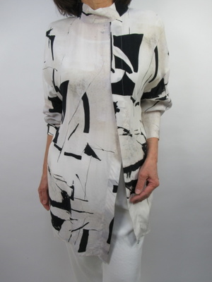 (変形ブラウスでスタイルッシュに)前は打ち合わせになったデザインでとてもスタイルッシュな一着。白のパンツでスッキリ合わせて。