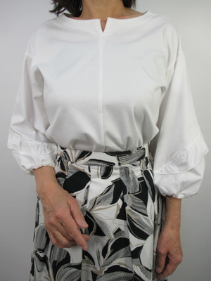 (白×黒でフェミニンコーデ)春らしい白のカットソーブラウスはお袖のフリルがキュートな1枚。ボタニカル柄のスカートは白黒なのでとても上品ですね。春を先取りしたフェミニンコーデ。