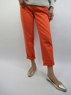 (春のカジュアルスタイル)春になるときれいな色をチョイスしたくなる。オレンジのカジュアルパンツで元気なデイリースタイルに。お出かけが楽しくなりそう。