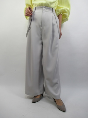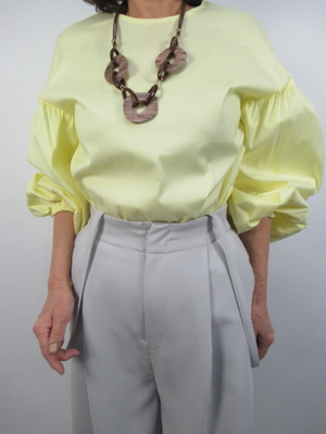 (春色のパステルトーンを全身に)淡い色の黄色いブラウスはボリューム袖でふわっとした印象に。ボトムスはとろみのある生地のワイドパンツ。淡いグレーがきいろとよく合う。サスペンダーは垂らしたままで。