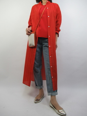 (鮮やかなオレンジ色のシャツワンピース)シャツワンピはボタンを外してデニムを羽織ってデイリーファッションを楽しんで。デニムはロールアップの春に嬉しい1着ですね。