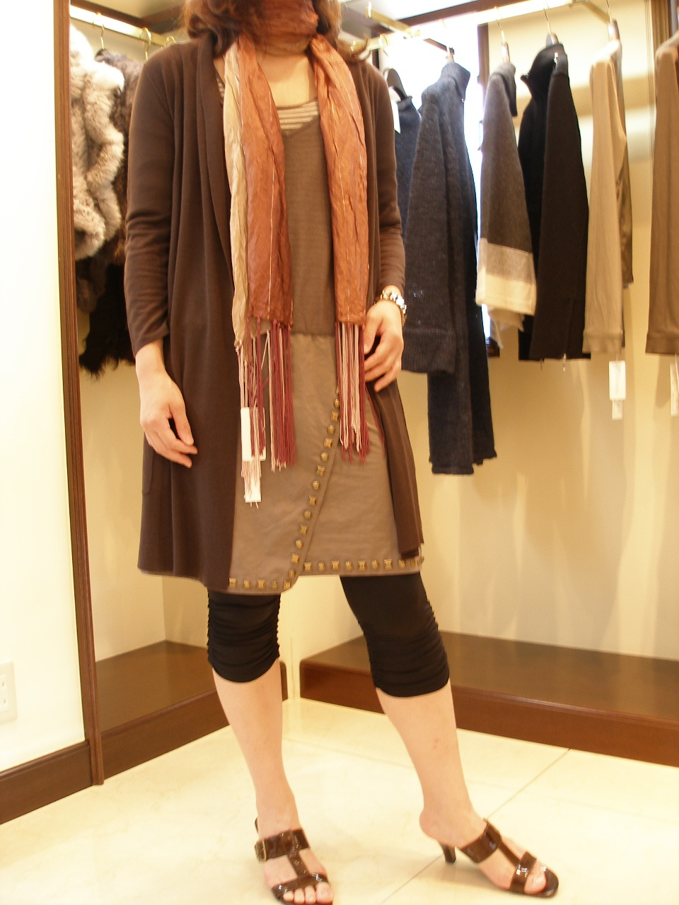 レギンススタイルにチャレンジ。以外に抵抗なく受け入れて頂く。ちょっとしたお出かけ事(ランチなど)きちんと感があるものをお求め頂いています。ストールは以前ご購入のベージュ系と合わせてもらうようにオススメ!
