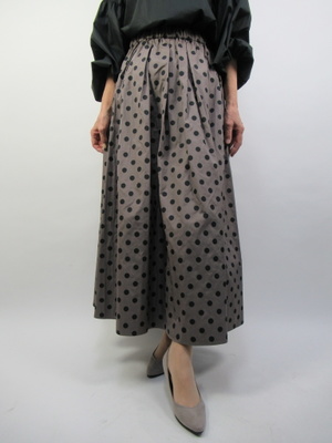 (大きなドット柄がとてもエレガント)大きなドット柄のボリュームスカートはウェストマークでメリハリをつけた着こなしに。黒のトップスでエレガントに。