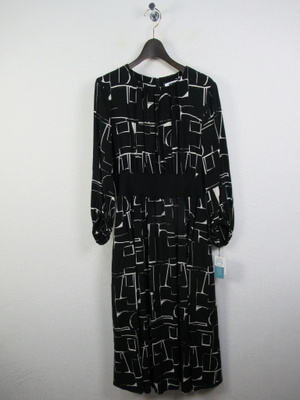 (ウェストにポイントのあるワンピース)黒に白の柄のモノトーンなワンピースもウェストにリブの切り替えがポイント。ふんわりとしたエレガントなお出かけワンピース。