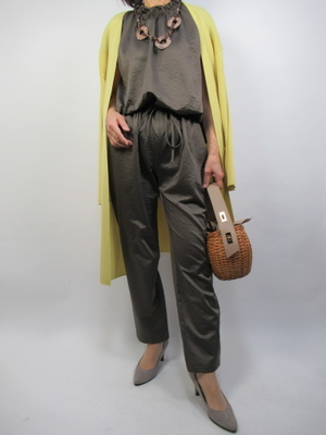 (きれいめオールインワンでお出かけスタイル)光沢と落ち感のある生地を使ったオールインワンはちょっとしたお出かけにも使える一着。ヒールと着流しカーデでエレガントな装いに仕上げました。