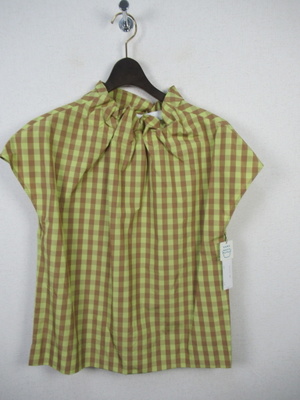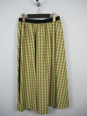 (ギンガムチェックのセットアップ)大きなギンガムチェックがとてもおしゃれなセットアップ。ブラウスの首周りとスカートのギャザーとでふんわり感を出したキュートなセットアップ