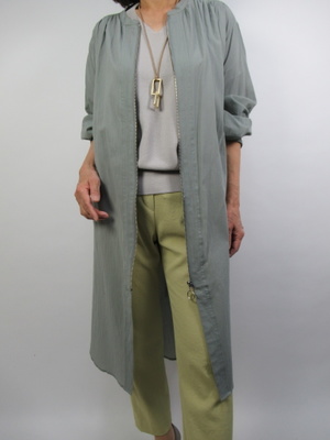 (薄手の春コートを羽織る)薄手の春コートはふんわりしていて軽さのある生地が特徴。さらにジップアップタイプでカジュアルラインとしても使える一枚。淡い色で全体をまとめたコーディネート。