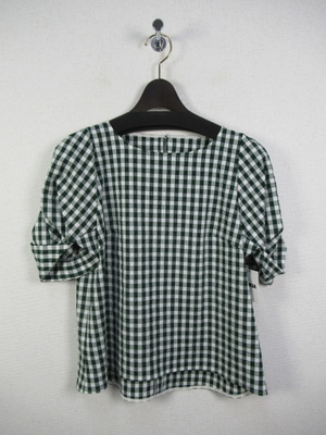 (ギンガムチェックでフェミニンに)黒のギンガムチェック柄のブラウスは袖にボリュームがあるキュートなデザインが特徴。合わせたのはカーキのギャザースカートでフェミニンコーデ。