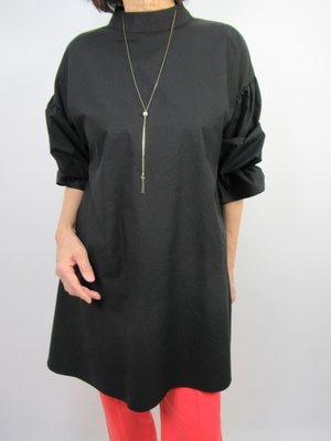 (黒×赤のコントラストを楽しむ)メリハリの効いた色のチョイス。元気な赤色をボトムスに黒のチュニックブラウスを重ねるコントラストの強い組み合わせを楽しむコーディネート。