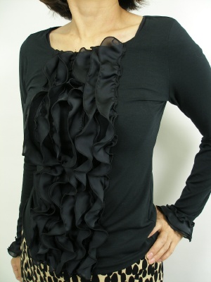 フリルのトップスと膝丈スカートで少し落ち着いたお出かけコーディネート。実はとっても楽な着心地なんですよ!エレガンス度90%、スタイリッシュ度10%。
