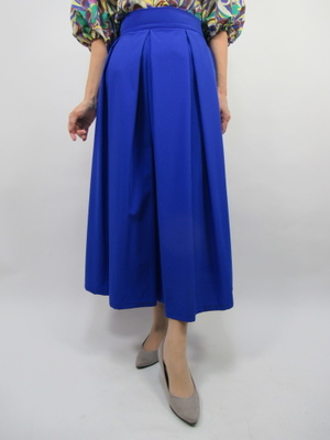 (ブルーのきれい色パンツスカート)スカートに見えるパンツはタック入りのフェミニンなデザイン。トップスは柄のプリントでブルー色を引き立たせて春らしいコーデに仕上げて。