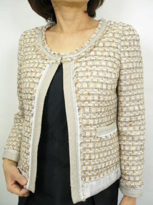 ハリのあるワンピにはツイードのジャケットが良く合います。上品でいながら流行りも押さえたスタイルに!エレガンス度70%、スタイリッシュ度30%。