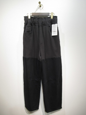(アレンジデニムでオフタイムを楽しく)カットソーと黒デニムのドッキングしたカジュアルパンツ。ナチュラルにシャツスタイルでデイリーを過ごしたい。