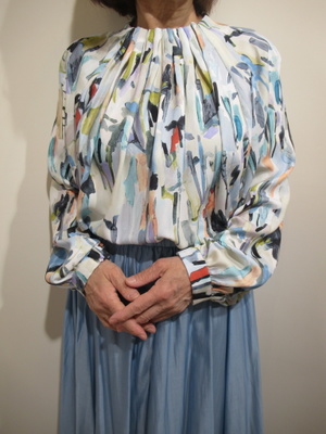 (ブルーで合わせた春のフェミニンコーデ)アートのような柄のブラウスが主役の華やぎコーディネート。首元のギャザーとふんわり袖が女性らしいやわらかさを演出します。合わせたのは、軽やかに揺れるブルーのフレアスカート。動くたびに美しいシルエットを描き、上品な印象 に。特別な日にも、普段のお出かけにも映える大人のスタイルです。 | |