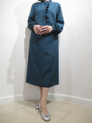 (深みのあるグリーンのワンピース)上品な深みグリーンが印象的な、大人のためのワンピース。繊細な小紋柄とフロントのさりげないフリルが、控えめな華やぎを添えます。ゆったりとしたシルエットで、身体のラインを美しくカバー。ベージュのバッグとシルバーのパンプスを合 わせた軽やかな抜け感を。きちんと感と女性らしさを両立した安心感のある一枚です。 | |