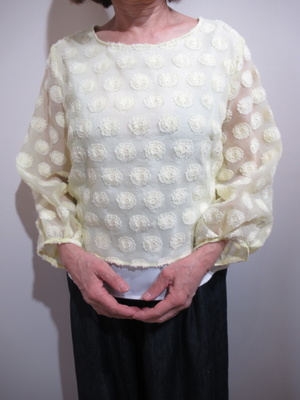 (やさしいレモンイエローのブラウス)やさしいレモンイエローが目を惹く、華やかなブラウスコーデ。立体感のある花のようなドット素材と透け感のある袖が、軽やかで女性らしい印象に。落ち着いたデニムワイドパンツを合わせて、甘さを程よく引き算。足元にも淡いカラーを取 り入れ、春らしい統一感をプラス。上品さを可愛らしさを兼ね備えた大人の爽やかスタイルです。