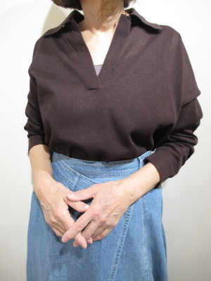 (デニムのスカートでフェミニンに)ラップ風のAラインスカートはデニム地でカジュアルな中にフェミニンな要素のあるスカート。上はシンプルにダークブラウンの襟付きニットで合わせてみました。 | |