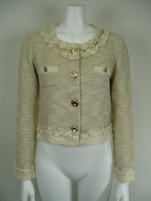 ニットのジャケットは短丈シャネルタイプ。袖口からシフォンのブラウスのフリルをのぞかして、フェミニンさをアピール!フェミニン度80%、エレガンス度20%。