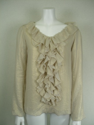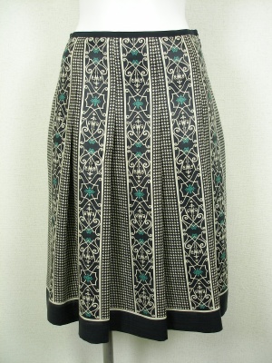 フリルブラウスにプリントスカートの甘いコーディネート。シックなカラーでまとめるのが正解!フェミニン度60%、エレガンス度40%。