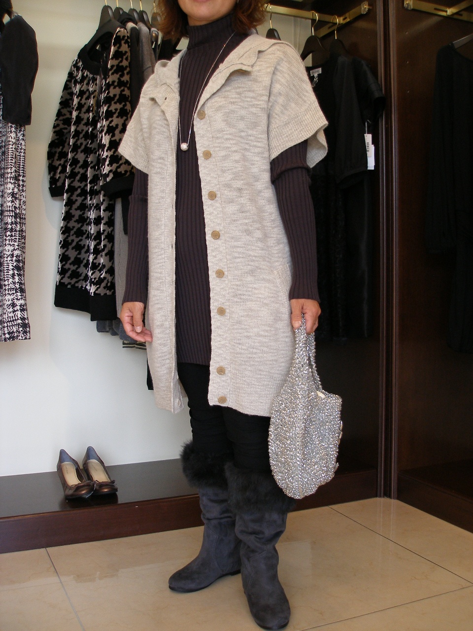 以前お買い上げ頂いた黒のパンツの上に合わせるものを・・・。とのご要望で、今回はロングカーデをお薦めしてみました。ロングカーデは下のニットの袖を出して色を楽しみたい。ブーツは軽さ、そしてファーがキュートですね!