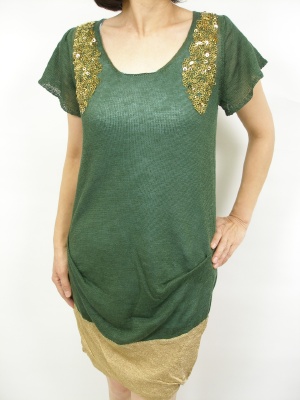 グリーンとゴールドの配色が個性的なワンピースは、バングルの重ね付けでオリエンタルな雰囲気に!エレガンス度60%、スタイリッシュ度40%。