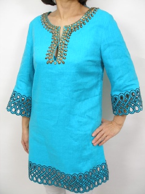 ターコイズブルーな綺麗なチュニックワンピ。ダークなストールを合わせて大人カジュアルの完成!アクティブ度70%、スタイリッシュ度30%。