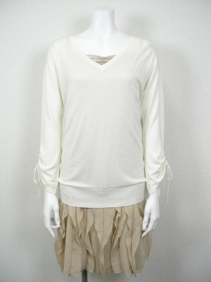 別のワンピのキャミだけを活用して、ニットワンピの裾からのぞかせました。グリーンのカーディが華やかに!エレガンス度80%、フェミニン度20%。