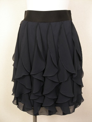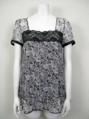 バラ柄チュニックとフリルスカートのロマンチックな着こなし。モノトーンでまとめると程よくシックに!フェミニン度80%、エレガンス度20%。