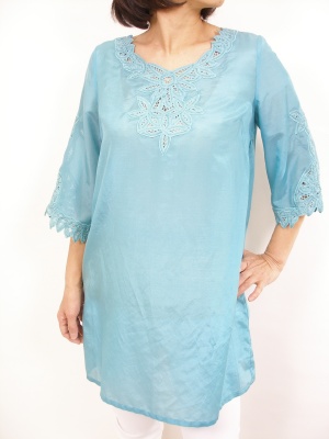 鮮やかなブルーが目を引きますね。白のパンツとのコントラストが綺麗なチュニックコーディネートです!スタイリッシュ度70%、フェミニン度30%。
