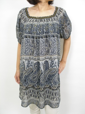 エスニックなワンピースをウエストマークでフェミニンに着こなして。ベージュのレギンスで軽やかに!フェミニン度60%、エレガンス度40%。