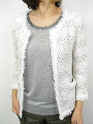 上品なニットジャケットは、あえてスカルTシャツでハズすのがカッコイイ!スタイリッシュ度90%、アクティブ度10%。