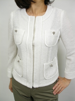 サルエルカーゴパンツとツイードのジャケット。甘辛ファッション。シルバーグレー×黒の中にブルーのストールが効いています。エレガンス度70%、スタイリッシュ度30%。