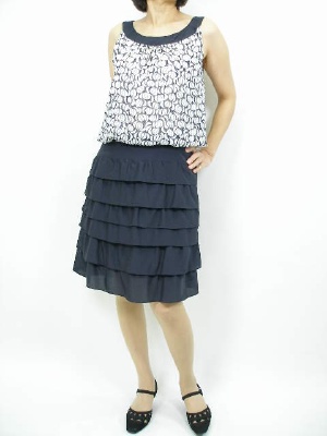 ティアードスカートとブラウスがつながったワンピースは、ネイビー×白で上品。夏に清涼感たっぷりのコーディネートです!エレガンス度100%。