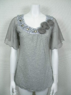 ビシュー付きカットソーとバラの花をデザインしたスカートとの相性がピッタリ。カメリア付きシューズで全体にふんわりしたイメージで!エレガンス度100%。