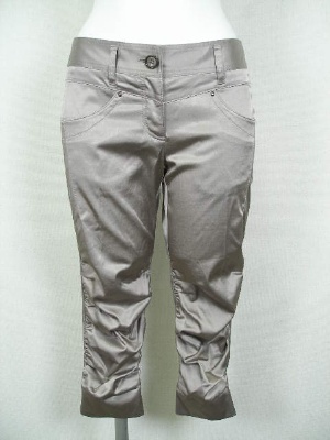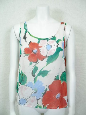 大柄で鮮やかなプリントブラウスをチラリとのぞかせて。光沢のあるパンツと組み合わせれば行動派女性のエレガンスコーディネート!エレガンス度60%、スタイリッシュ度40%。