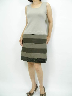 スパンコールがオシャレなタイトのワンピース。綿ジャケットを合わせるときちんとした印象になりますね!エレガンス度70%、スタイリッシュ度30%。