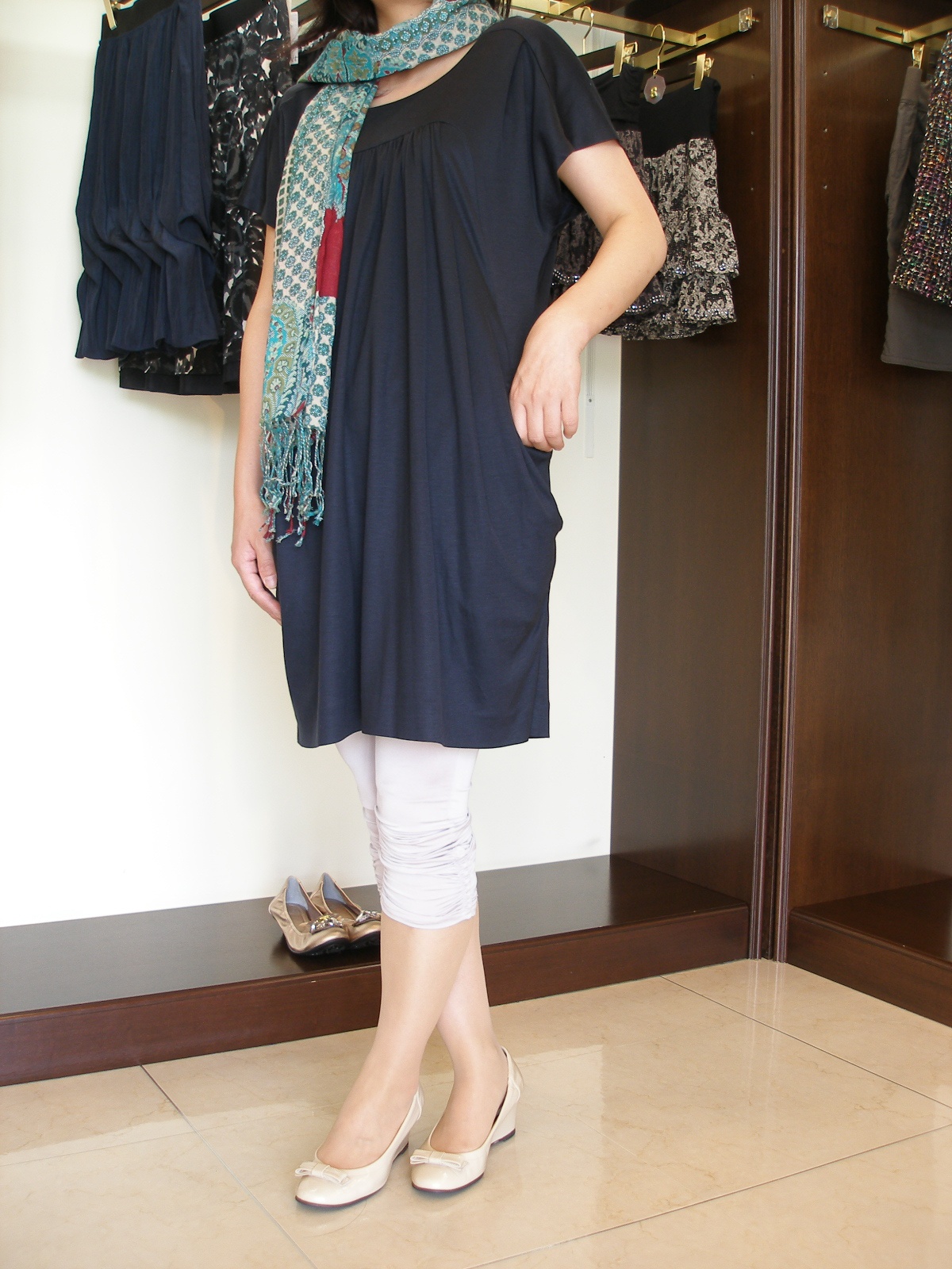 レギンスファッションにチャレンジ。紺色のワンピースとストールの相性がよくお似合いでした!