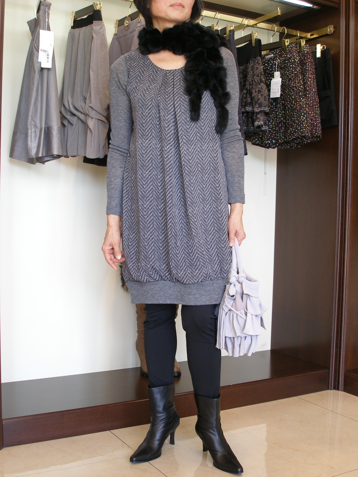 レギンスをブーツインして今年風に挑戦して頂きました。スポーツジムに通って、整えられたスリムなお体にワンピースがとても良くお似合いです!