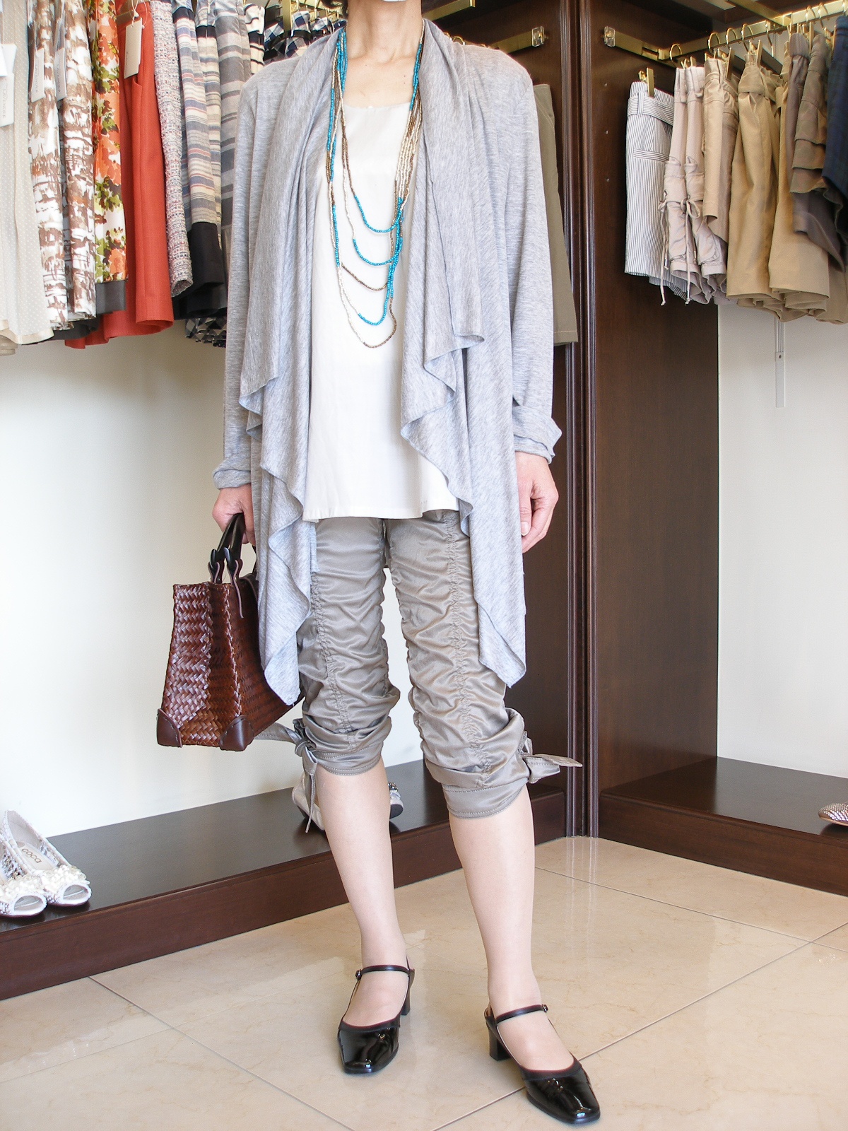タイトなシンプル系がすごくお似合いです。カーディとリボンパンツの甘辛を上手にはきこなして下さっています。「合うものを、ちゃんと合わせて下さるラベンダーさんなので安心できる」とおっしゃって頂きました。