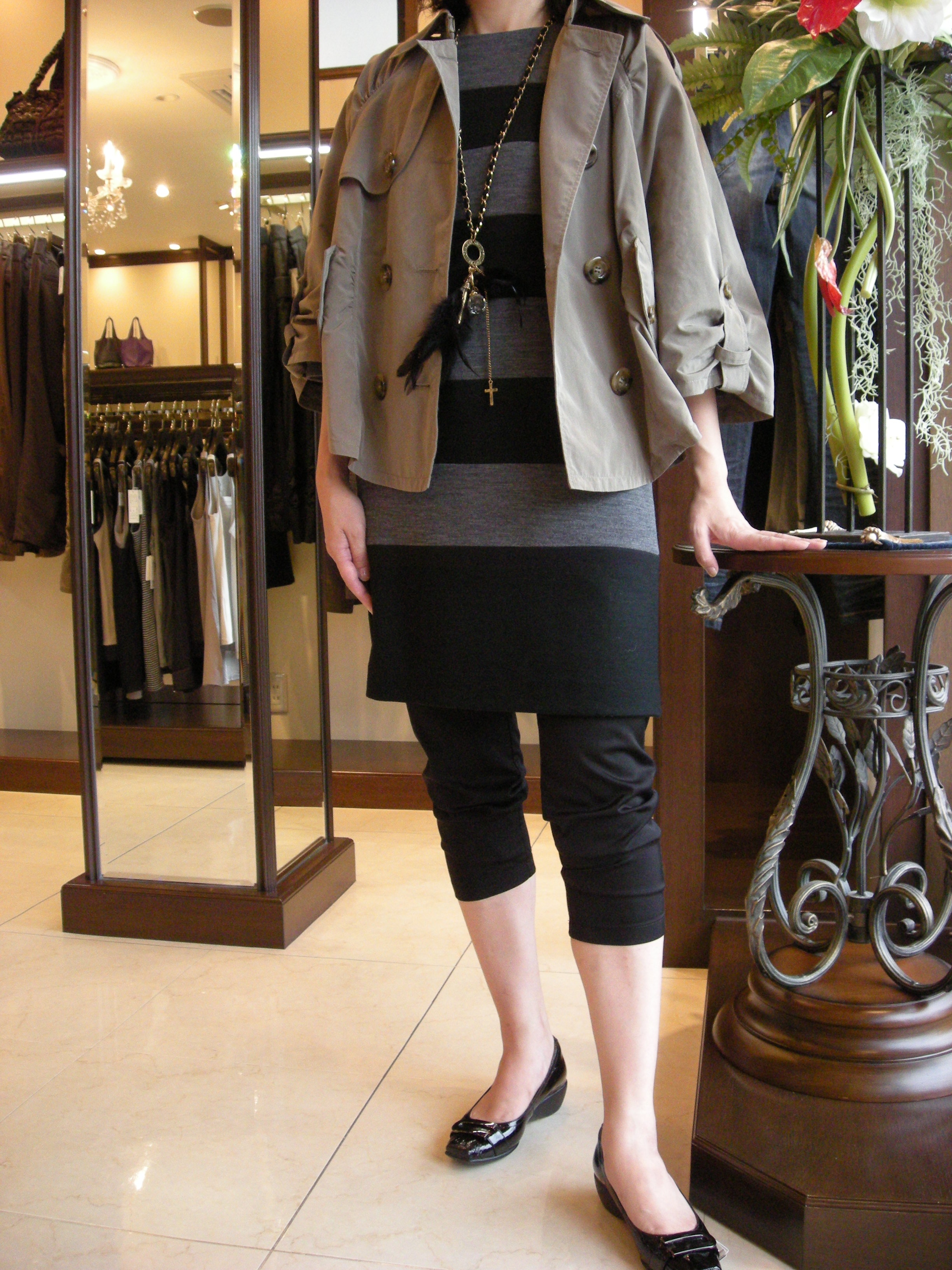 ボーダーワンピーは裾の方の黒の分量が多くレギンスとのつながりで足長効果がでます。トップスもショート丈で全体に目線が上に行きバランスのとれたコーディネートです。同じような色と丈のブルゾンをお持ちなので合わせて頂きました!