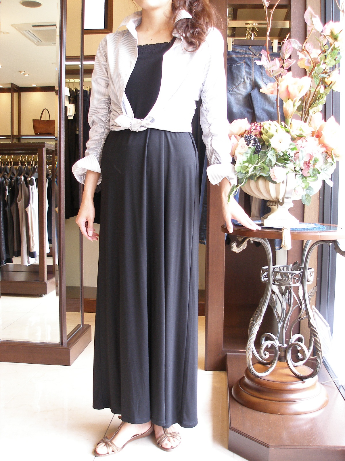 「マキシワンピのコーディネートを特集」をご覧になり早速ご試着に来られました。スタイル抜群の方なのでバッチリ丈も決まりバランスの良いスタイリングが出来ました。シャツを絞ることでウエストにメリハリができ、まとまりも良いですね!
