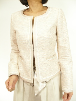 柔らかい春色のジャケットを白やベージュのナチュラルトーンでまとめて華やいだコーディネートにしてみました!エレガンス度100%。