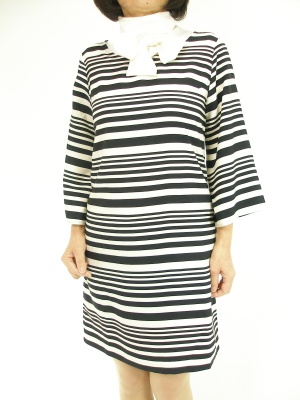 メリハリのあるボーダー柄のサックワンピは白のインナーで爽やかに!エレガンス度80%、フェミニン度20%。