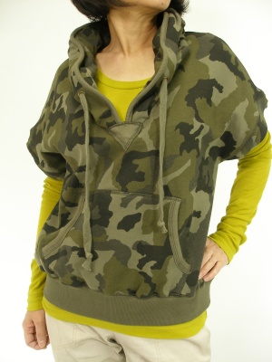 カーキ色のカモフラ柄なら差し色はマスタードがお薦め。ヒールスニーカーで大人のカジュアルに!アクティブ度100%。