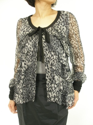 アニマル柄のブラウスは膝丈タイトスカートで女らしく着こなしたい。同系色で揃えるのがポイント!エレガンス度80%、スタイリッシュ度20%。